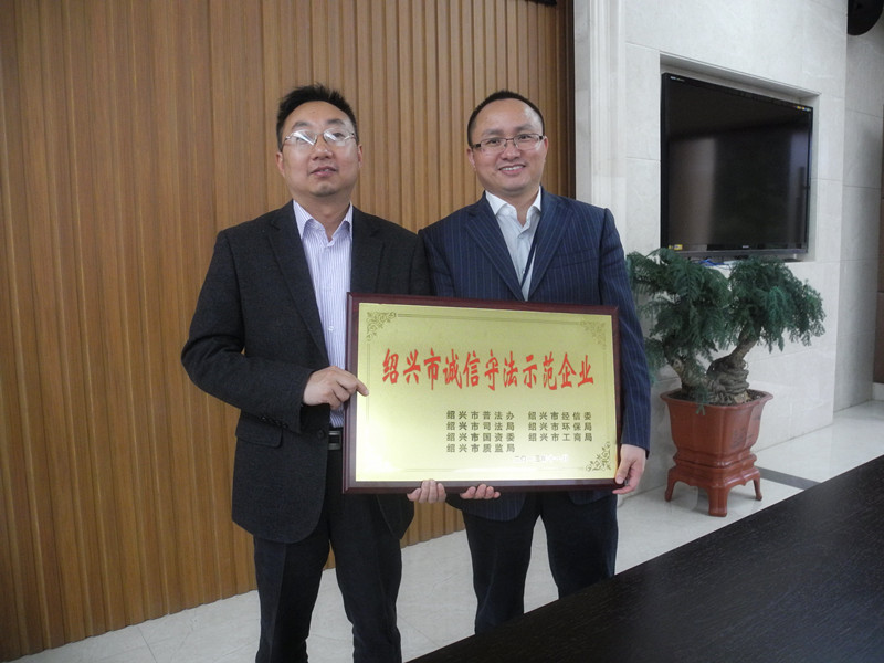 公司一貫堅(jiān)持誠(chéng)實(shí)守信,依法經(jīng)營(yíng)原則,經(jīng)紹興市普法辦、紹興市經(jīng)信委、紹興市司法局、紹興市環(huán)保局、紹興市國(guó)資委、紹興市工商局、紹興市質(zhì)監(jiān)局等7家部門聯(lián)合評(píng)審,2013年11月被評(píng)定為紹興市“誠(chéng)信守法示范企業(yè)”。